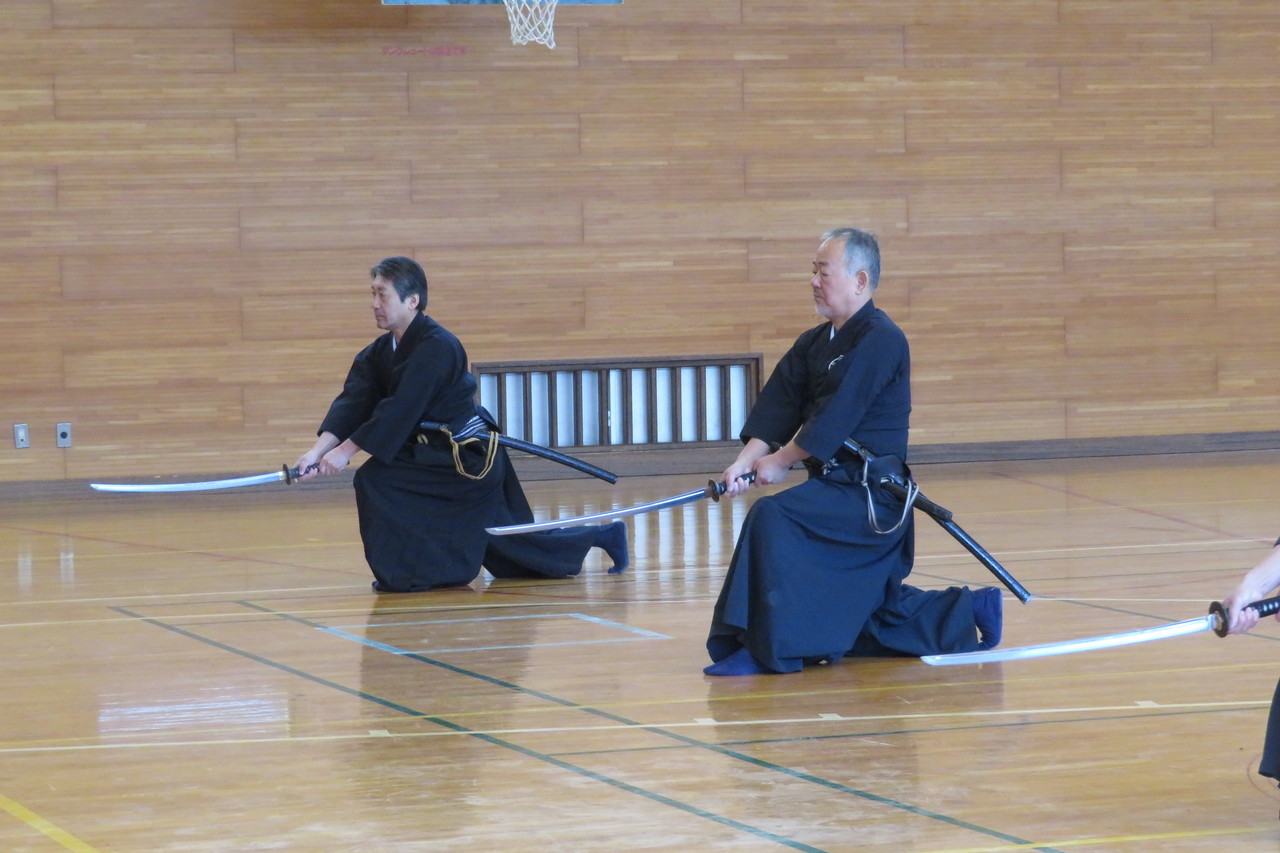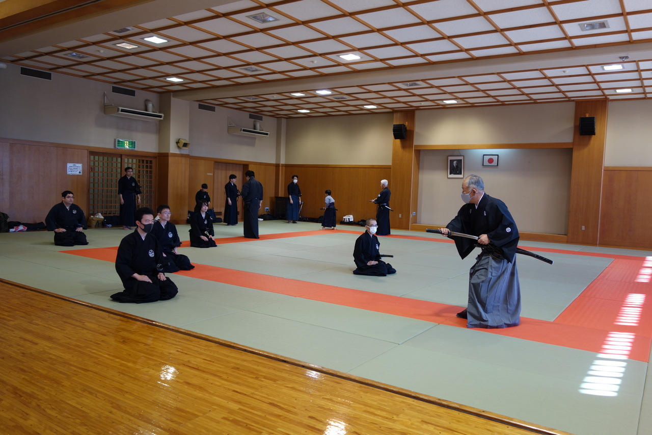 午前中は初心者である無級から二段まで、午後は三段以上の二部制にて行われ、各級・段位毎に分かれて、それぞれ財団法人無外流に所属する各会の先生方から指導をしていただきました。